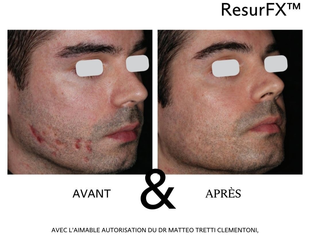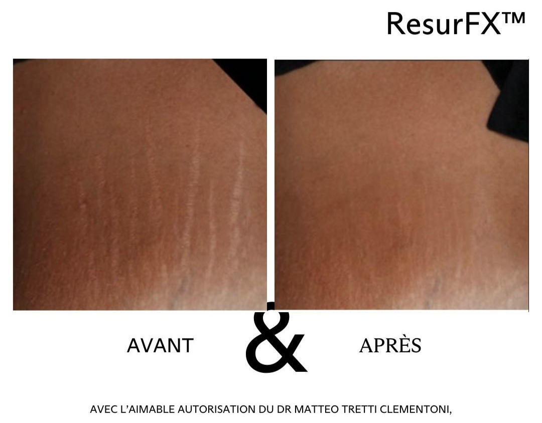 Contrairement à d’autres technologies fractionnées, ResurFX™ ne nécessite qu’un seul passage pour être efficace, ce qui vous fait gagner du temps et protège la peau du patient. ResurFX™ utilise un laser à fibre de 1565 nm et un scanner très avancé, qui vous permet de choisir parmi plus de 600 combinaisons de forme, de taille et de densité pour un traitement optimal.