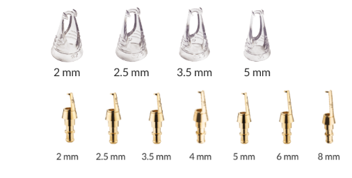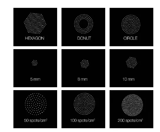 7 tailles de spots pour des traitements personnalisés dont 4 sont également disponibles sous forme d'embouts jetables