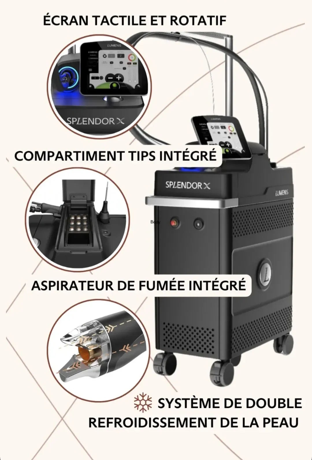 Splendor x Lancé par LUMENIS, leader mondial des technologies laser et énergétiques, il s'agit du seul système laser Alexandrite et Nd:YAG alimenté par la technologie BLEND X pour une puissance, une vitesse, une efficacité et une polyvalence sans précédent. SPLENDOR X vous permet de personnaliser et d'adapter l'épilation au laser et d'autres traitements sur une large gamme de tons de peau, comme jamais auparavant. Il s'agit d'un système laser innovant à fibre carrée offrant une couverture cutanée optimale par de grands spots carrés, offrant des traitements sûrs et efficaces grâce à une gestion unique de l'énergie, ainsi qu'un évacuateur de panache intégré et favorisant une expérience patient optimale grâce à un système de refroidissement double (DCS).