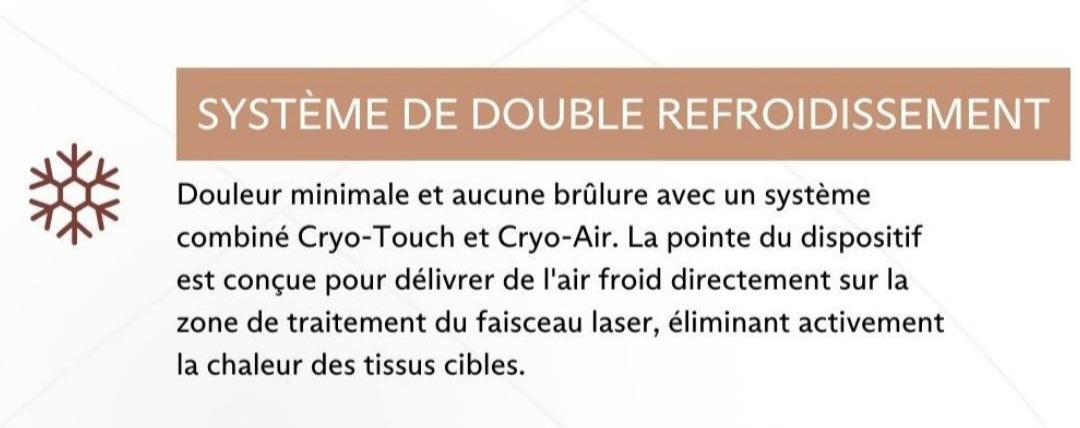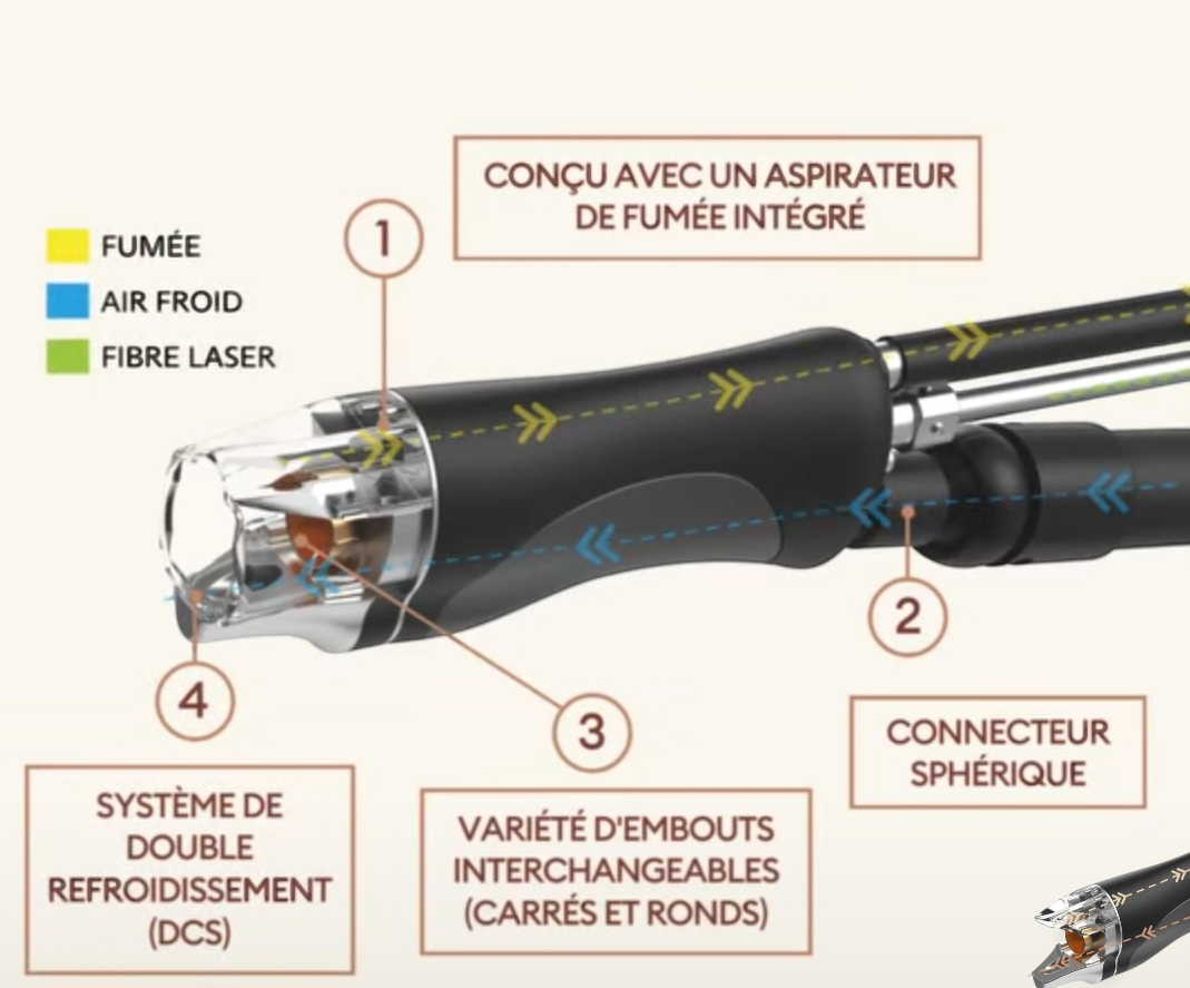Emission laser bilatérale de longueurs d'onde Nd:YAG (1064 nm) et Alexandrite (755 nm), proportions synchronisées et réglables.